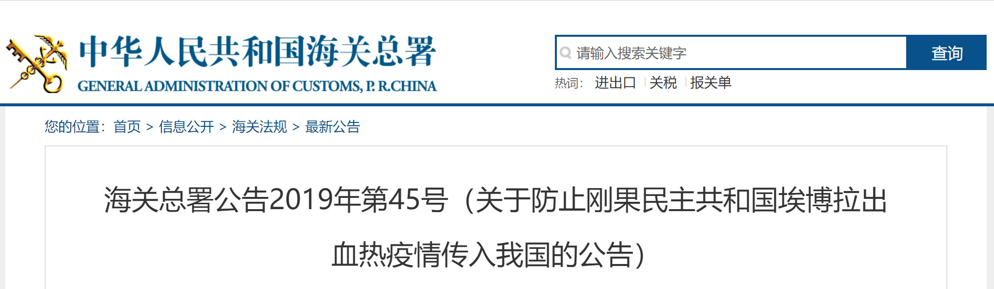 海關(guān)總署公告2019年第45號(關(guān)于防止剛果民主共和國埃博拉出血熱疫情傳入我國的公告)