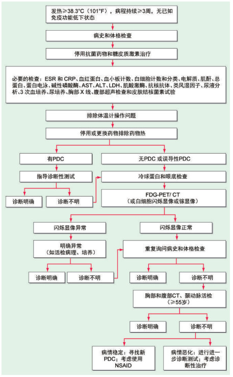 圖:13-1 FUO的臨床路徑。ALT,丙氨酸氨基轉(zhuǎn)移酶;AST,天冬氨酸氨基轉(zhuǎn)移酶;CRP,C反應(yīng)蛋白;ESR,紅細(xì)胞沉降率;FDG-PET/CT,18F-氟代脫氧葡萄糖PET/CT;LDH,乳酸脫氫酶;PDC,潛在診斷線索(所有指向診斷的局部癥狀、體征和異常);NSAID,非甾體抗炎藥。