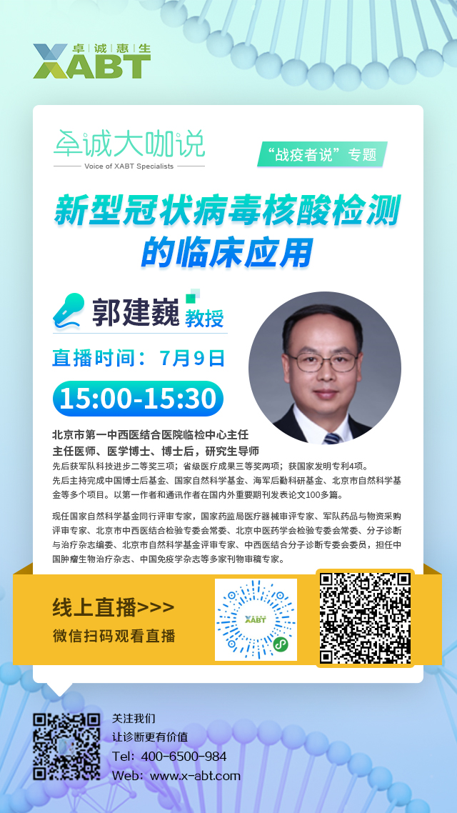 卓誠大咖說之“戰(zhàn)疫者說”專題第二期將于7月9日15:00正式開播,我們非常榮幸邀請(qǐng)到北京市第一中西醫(yī)結(jié)合醫(yī)院臨檢中心郭建巍教授為我們帶來《新型冠狀病毒核酸檢測的臨床應(yīng)用》的主題講座,期待各位屆時(shí)蒞臨直播間,共同學(xué)習(xí),互相啟發(fā)!